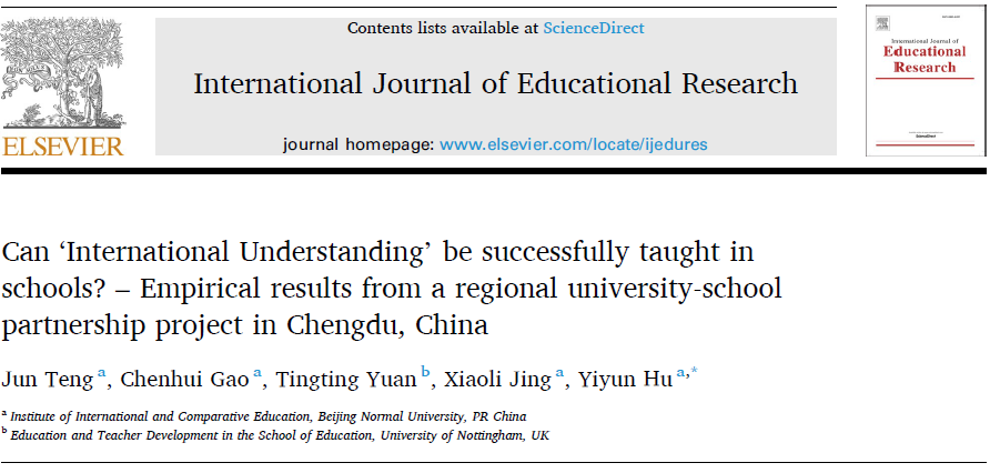 7月31日,北京师范大学国际与比较教育研究院滕珺教授、胡昳昀副教授、荆晓丽博士、高晨辉硕士研究生与英国诺丁汉大学袁婷婷教授在教育学期刊《International Journal of Educational Research》(SSCI Q2)上合作发表论文“Can ‘International Understanding’ be successfully taught in schools? – Empirical results from a regional university-school partnership project in Chengdu, China”。