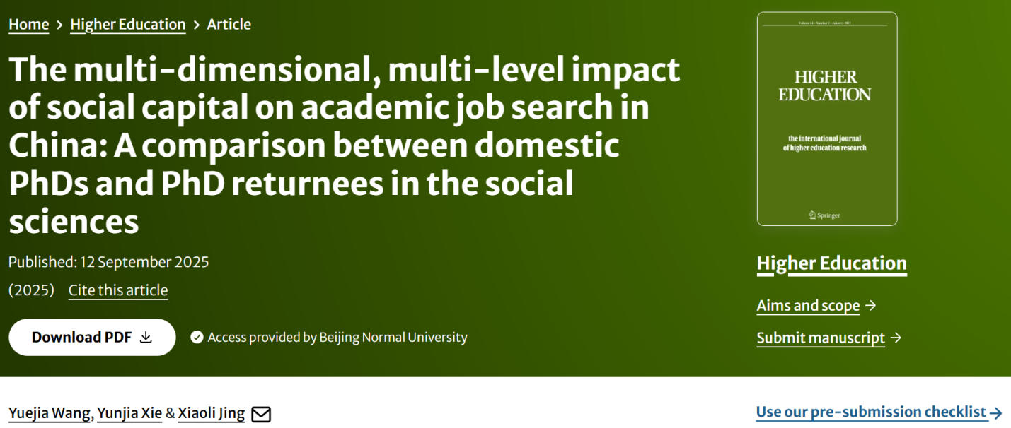 我院荆晓丽博士与美国纽约州立大学布法罗分校博士候选人王越佳、加拿大麦吉尔大学博士生谢芸佳于2025年9月12日在国际高等教育领域权威期刊《Higher Education》(SSCI Q1)合作发表了题为“The multi-dimensional, multi-level impact of social capital on academic job search in China: A comparison between domestic PhDs and PhD returnees in the social sciences”的研究论文。该论文聚焦中国日益激烈的博士毕业生学术求职环境,系统比较了社会科学领域中本土博士与海归博士在学术求职经历方面的异同。