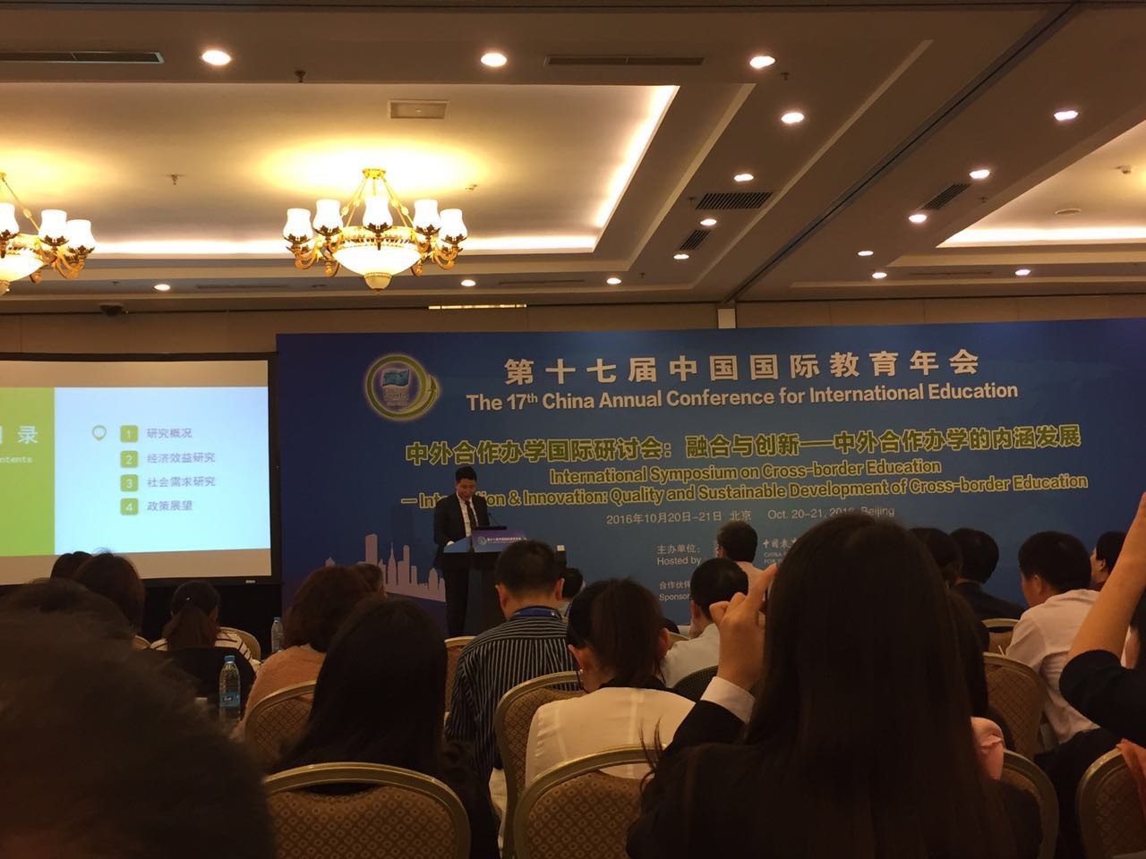我院刘宝存教授和刘强副教授应邀出席了年会。2016年10月20日,刘宝存教授主持了年会论坛之中外合作办学国际研讨会的分组会议,刘强副教授在分组会议中做了题为《中外合作办学的经济效益与社会需求研究》的成果报告。在报告中,刘强副教授描述了改革开放三十多年来中外合作办学的发展状况,分析了中外合作办学对经济发展水平、居民生活水平以及科技产出产生的效益,并通过估计中外合作办学规模的影响因素模型,预测了未来五年中外合作办学的办学规模和社会需求。