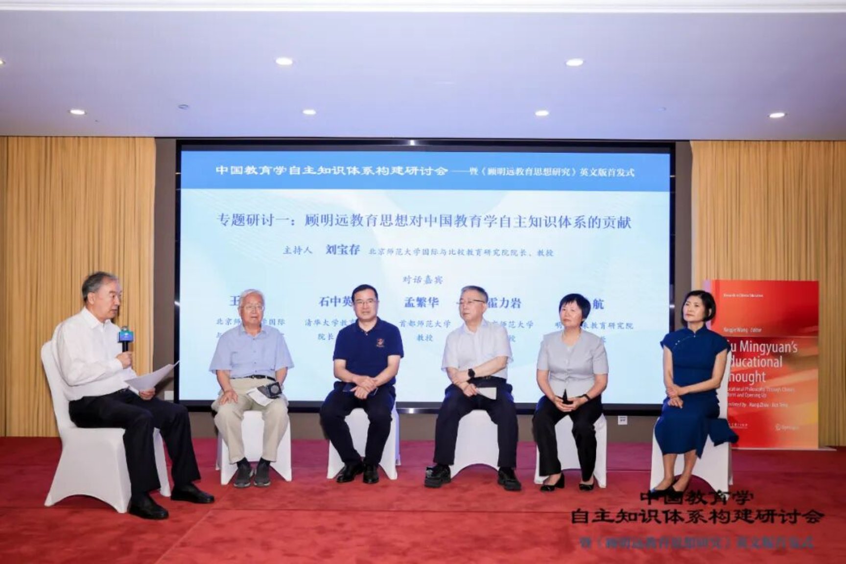 第一场专题研讨由王英杰教授做引导报告,我院刘宝存教授主持圆桌研讨,清华大学石中英教授、首都师范大学孟繁华教授、北京师范大学霍力岩教授和明远未来教育研究院副院长周航围绕“顾明远教育思想对中国教育学自主知识体系的贡献”主题展开对话。