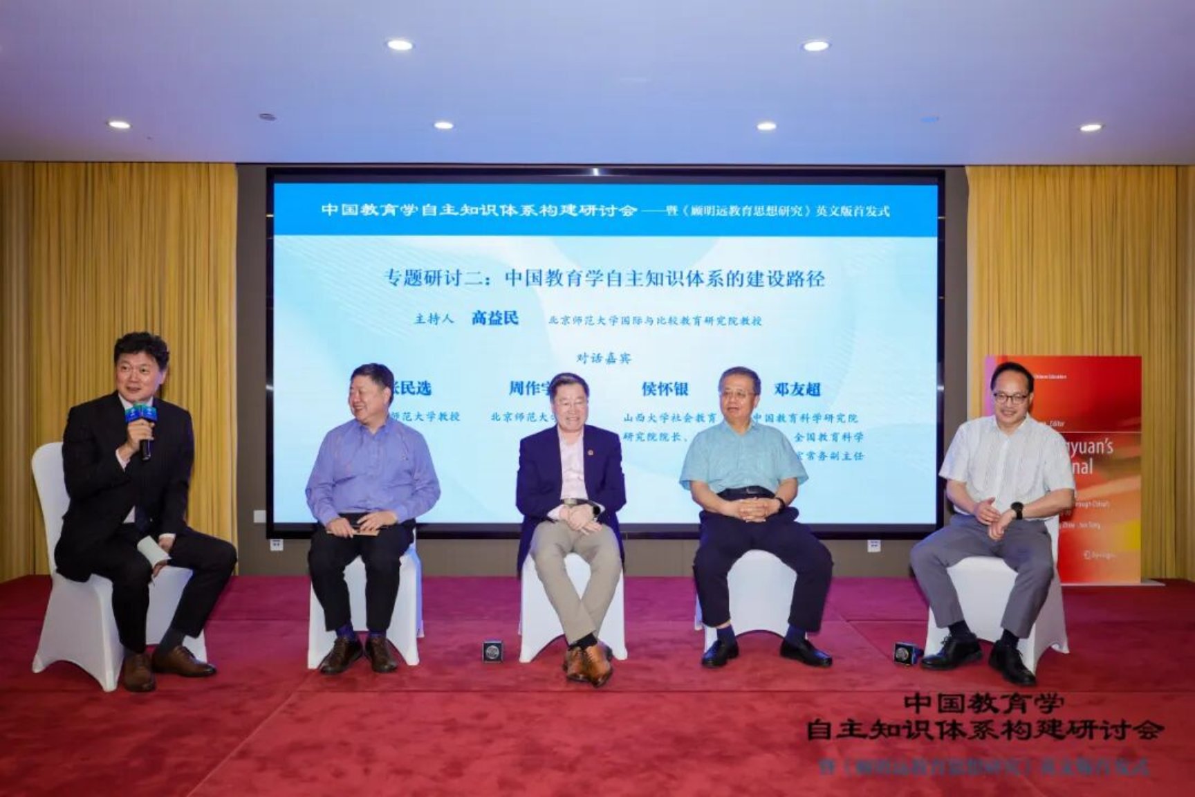 第二场专题研讨由中国教育科学研究院研究员、全国教育科学规划办公室常务副主任邓友超做引导报告,我院高益民教授主持圆桌研讨,上海师范大学张民选教授、北京师范大学周作宇教授、山西大学侯怀银教授围绕“中国教育学自主知识体系的建设路径”主题展开对话。