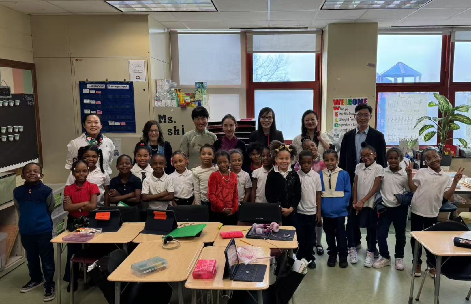 此外,Jennifer Lewis教授、余旻教授带领我院滕珺教授、向芯博士及来自华东师范大学的程亮教授、游韵教授走访了两所底特律公办小学:在以中文、西班牙语、法语浸入式教育为特色的外国语小学F.L.I.C.S.,及以西班牙裔学生为主体的Bennett学校。两校领导及师生均对访客表达了热烈欢迎并与滕珺教授交换了礼物。