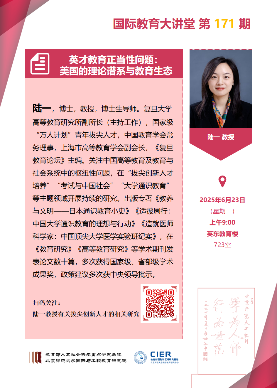 2025年6月23日上午,北京师范大学国际与比较教育研究院第171期国际教育大讲堂如期召开。复旦大学高等教育研究所副所长陆一教授为我院师生带来了题为“英才教育正当性问题:美国的理论谱系与教育生态”的讲座。讲座由滕珺教授主持。