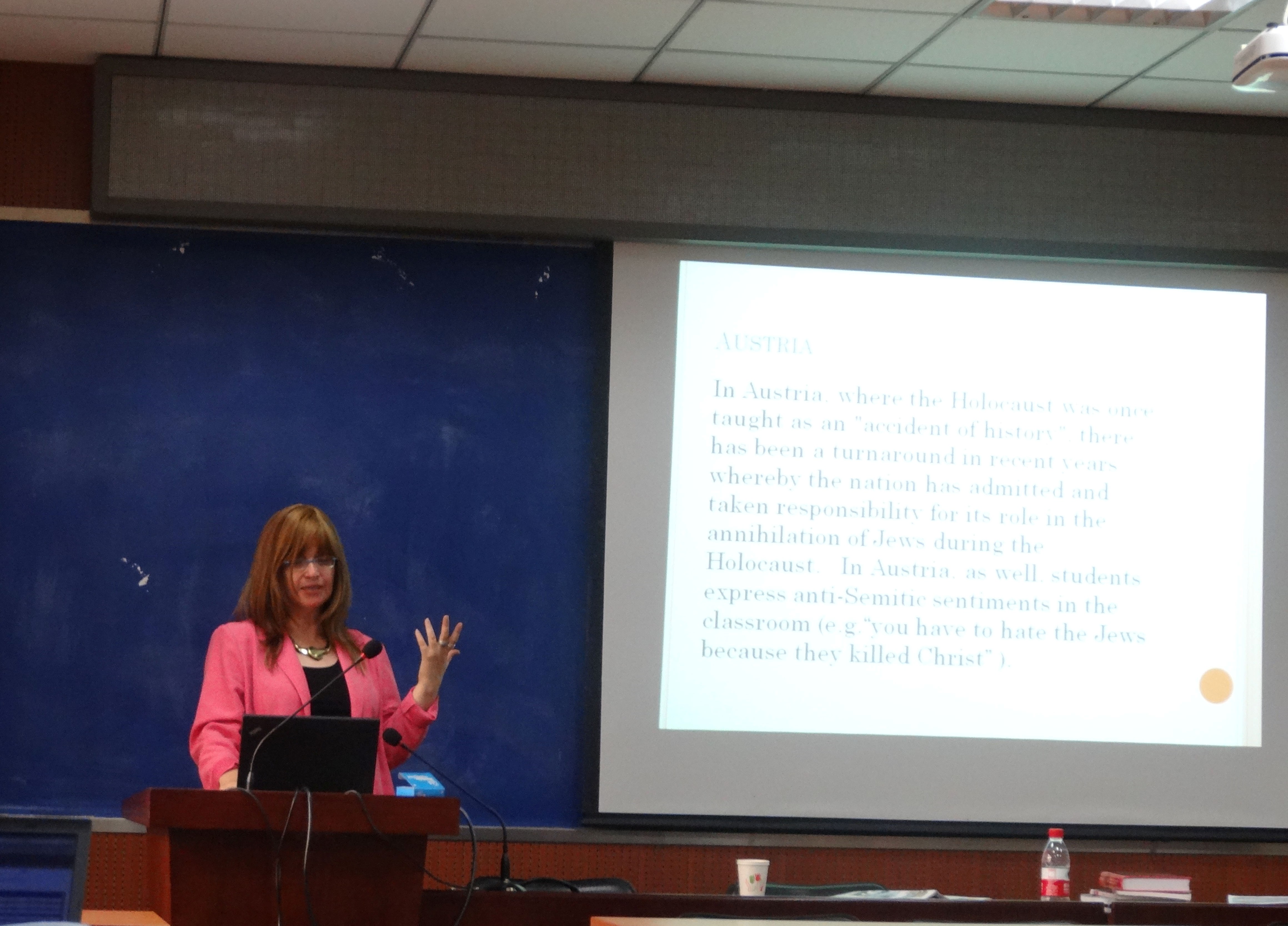 本场讲座主要由三部分构成。讲座的第一部分,Zehavit Gross教授首先对“大屠杀教育”的相关知识进行厘清。她指出,这里的大屠杀(holocust)主要是指第二次世界大战中纳粹对犹太人的大屠杀。2005年联合国决议将每年的1月27日定为“国际大屠杀纪念日”,并强烈要求成员国开展有关大屠杀的教育项目,以吸取大屠杀的经验教训、避免种族灭绝。接着,她呈现了德国、奥地利、波兰、澳大利亚、瑞士、加拿大、以色列等七国当前的大屠杀教育现状。在讲座的第二部分,Zehavit Gross教授讲解了全球公民理论和世界大同主义理论,重点解析了大屠杀教育与全球公民、世界大同主义之间的关系;并指出研究已发现,中小学公民课程中的大屠杀教育要比历史课程中的大屠杀教育更加有效。
