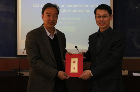 2013年11月11日下午,芬兰坦佩雷大学高等教育研究所代理所长蔡瑜琢副教授在北京师范大学英东楼723教室为国际与比较教育研究院第51期国际教育大讲堂做了题为“欧盟对中国高等教育合作战略”(EU Strategies on Chinese higher education cooperation)的学术讲座,国际与比较教育研究院的老师、博士生、硕士生以及国际留学生都积极参与了此次讲座。讲座开始之前,北京师范大学国际与比较教育研究院院长刘宝存教授代表该院向蔡瑜琢教授颁发了基地客座教授聘书。