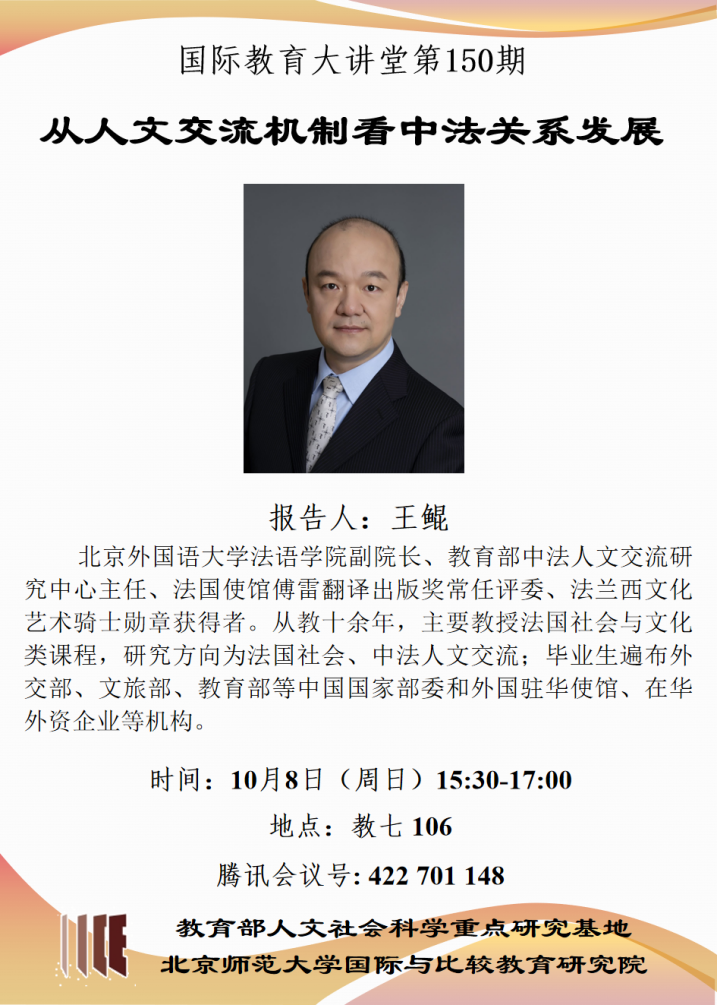 2023年10月8日下午,北京师范大学国际与比较教育研究院第150期《国际教育大讲堂》通过线上线下相结合的形式举行。北京外国语大学王鲲老师受邀为同学们带来了题为“中法人文交流与中法关系发展”的精彩讲座。讲座由刘敏副教授主持,我院部分研究生及院外对法国教育感兴趣的本科生参加了讲座。