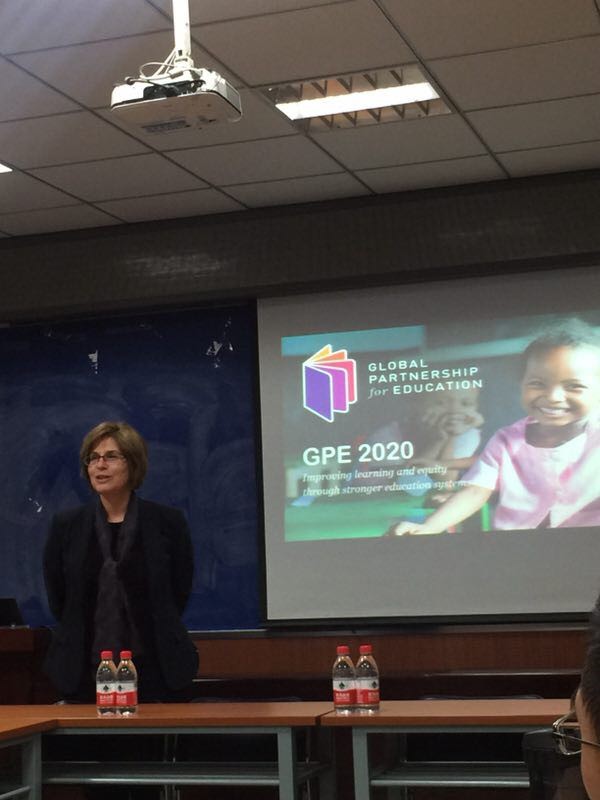卡伦•芒迪博士从“什么是全球教育合作伙伴关系”的命题入手,向在座的各位老师同学介绍了全球教育合作组织,同时介绍了该组织的合作伙伴,现阶段的运营情况以及国际教育发展的新内容。此外,卡伦博士还从“改良的和更加公平的学习成果、提高性别平等和包容、有效和高效的教育体系”等方面介绍了“GPE 2020年计划与前景”战略的目标。同时,卡伦博士向大家介绍了GPE的问责制度,指出这一制度的核心内容包括:以证据为基础的部门规划和投资更好的数据;以LEGs, JSRs, CSEF为核心的多方对话;不断提高的成果与融资的问责理念。