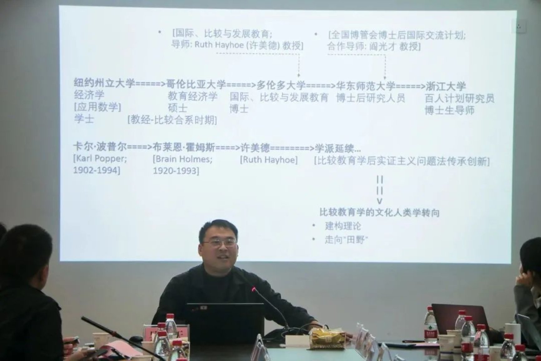 两校比较教育学科青年教师代表分享各自研究领域与研究心得。我院丁瑞常副教授对当前比较教育面临的学科危机作出回应,指出比较教育研究者应具备发现问题、提出观点的意识。我院讲师胡昳昀博士指出,作为“冷门领域”的研究者,需要构建新视野,通过梳理相关领域的既有研究,搭建符合研究主题的理论框架。浙江大学教育学院百人计划研究员吴寒天指出,比较教育学的文化人类学转向离不开理论建构与走向“田野”,要注重历史社会学研究与域外民族志研究。浙江大学教育学院特聘副研究员段世飞从“天下一家”视角出发,指出面对全球问题、人工智能对教育的冲击,要培养具有全球竞争力的国际化人才,以“天下一家”理念为契机讲好中国故事。